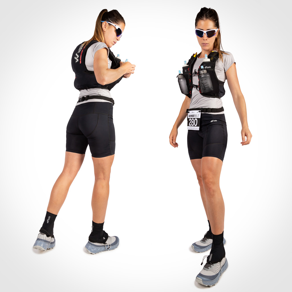 - 1 posterior con velcro sujetador para una bolsa de hidratación o para guardar de material de mayor tamaño (con buen alcance de brazos accesible en carrera).