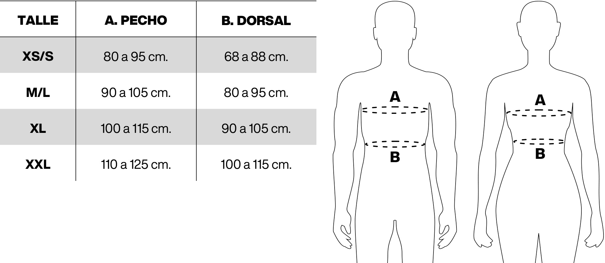 Medí el contorno de tu pecho (zona de mayor protuberancia) y de tu dorsal (debajo del pecho y arriba de la cintura) y buscá la correlación con el talle del chaleco.